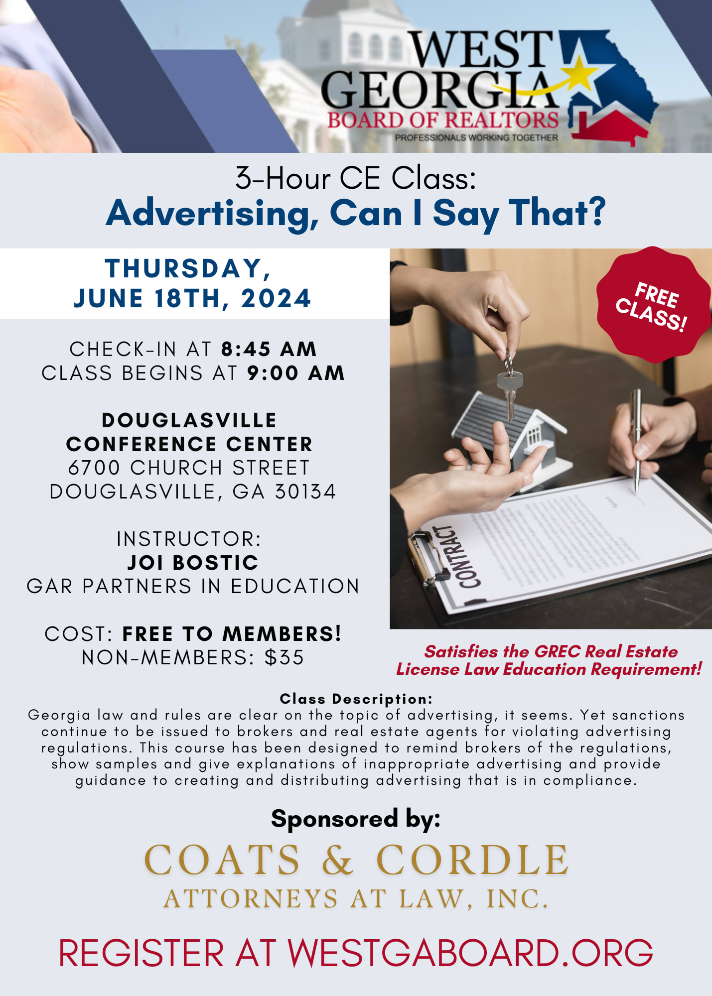 Georgia law and rules are clear on the topic of advertising, it seems. Yet sanctions continue to be issued to brokers and real estate agents for violating advertising regulations. This course has been designed to remind brokers of the regulations, show samples and give explanations of inappropriate advertising and provide guidance to creating and distributing advertising that is in compliance.