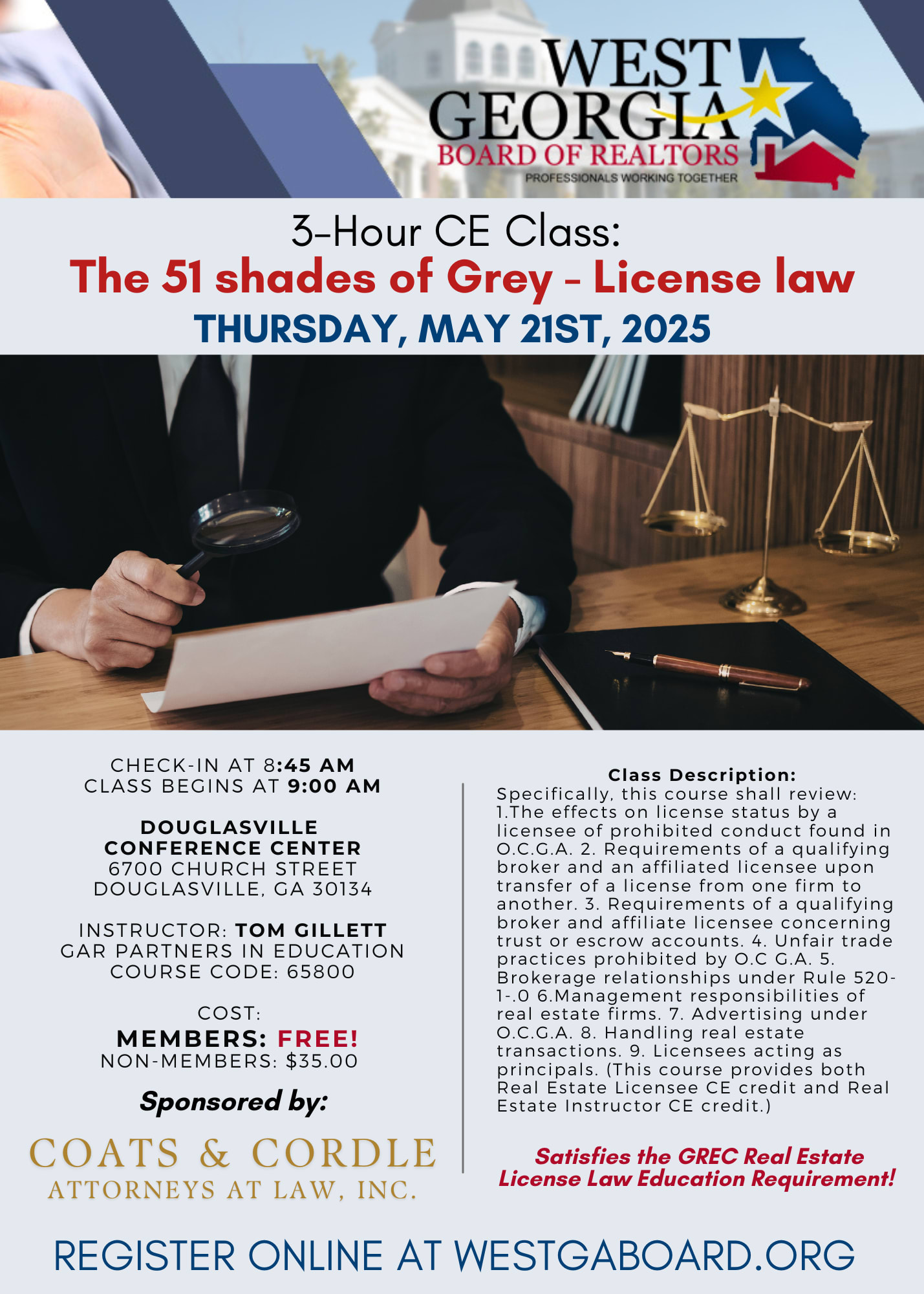 THIS COURSE SATISFIES THE GREC REAL ESTATE LICENSE LAW EDUCATION REQUIREMENT. Specifically, this course shall review: 1.The effects on license status by a licensee of prohibited conduct found in O.C.G.A. 2. Requirements of a qualifying broker and an affiliated licensee upon transfer of a license from one firm to another. 3. Requirements of a qualifying broker and affiliate licensee concerning trust or escrow accounts. 4. Unfair trade practices prohibited by O.C G.A. 5. Brokerage relationships under Rule 520-1-.0 6.Management responsibilities of real estate firms. 7. Advertising under O.C.G.A. 8. Handling real estate transactions. 9. Licensees acting as principals. (This course provides both Real Estate Licensee CE credit and Real Estate Instructor CE credit.)