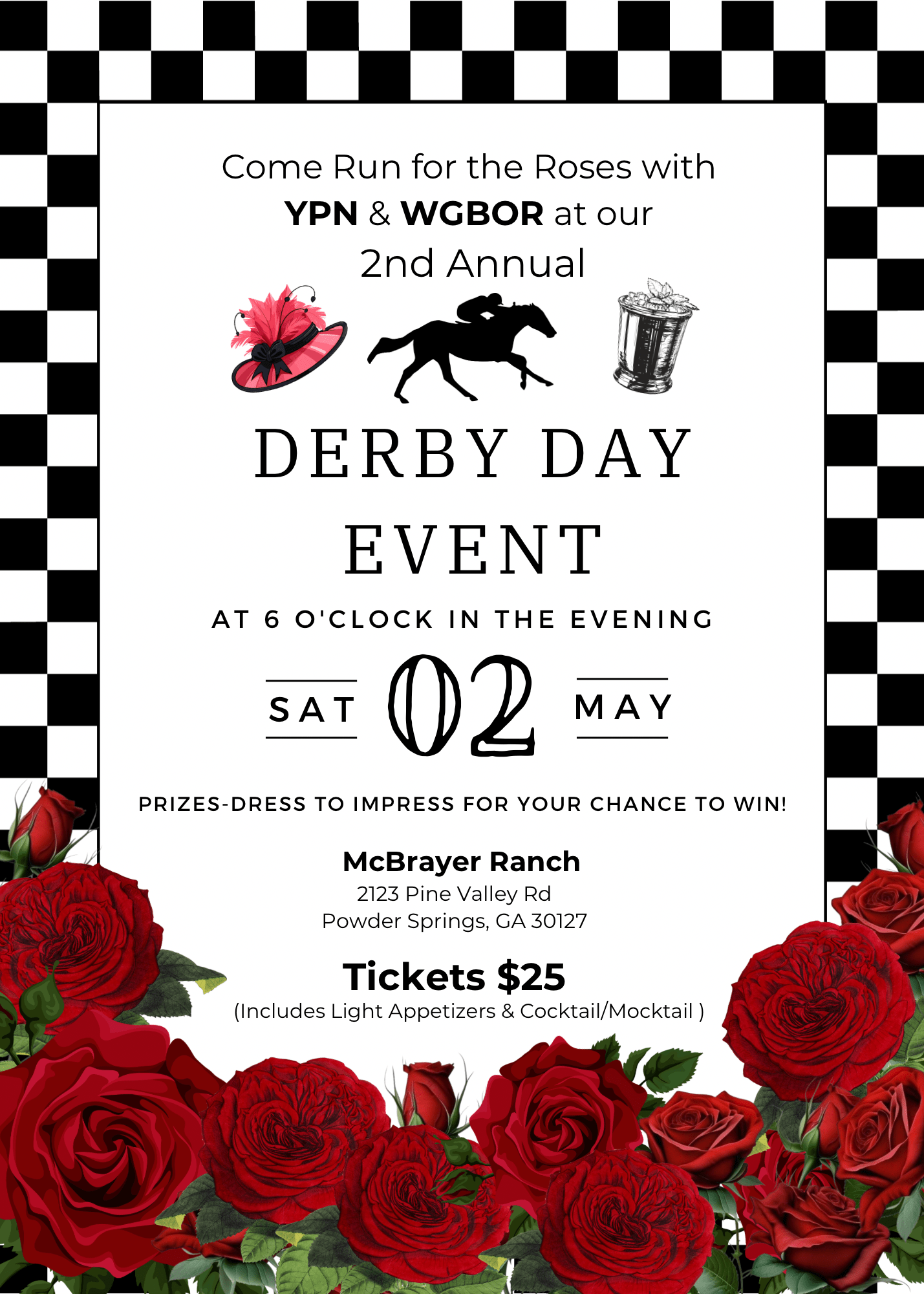 Join the Young Professionals Network (YPN) and the West Georgia Board of REALTORS® (WGBOR) for our 2nd Annual Derby Day Event—an evening of fun, networking, and classic Kentucky Derby style!