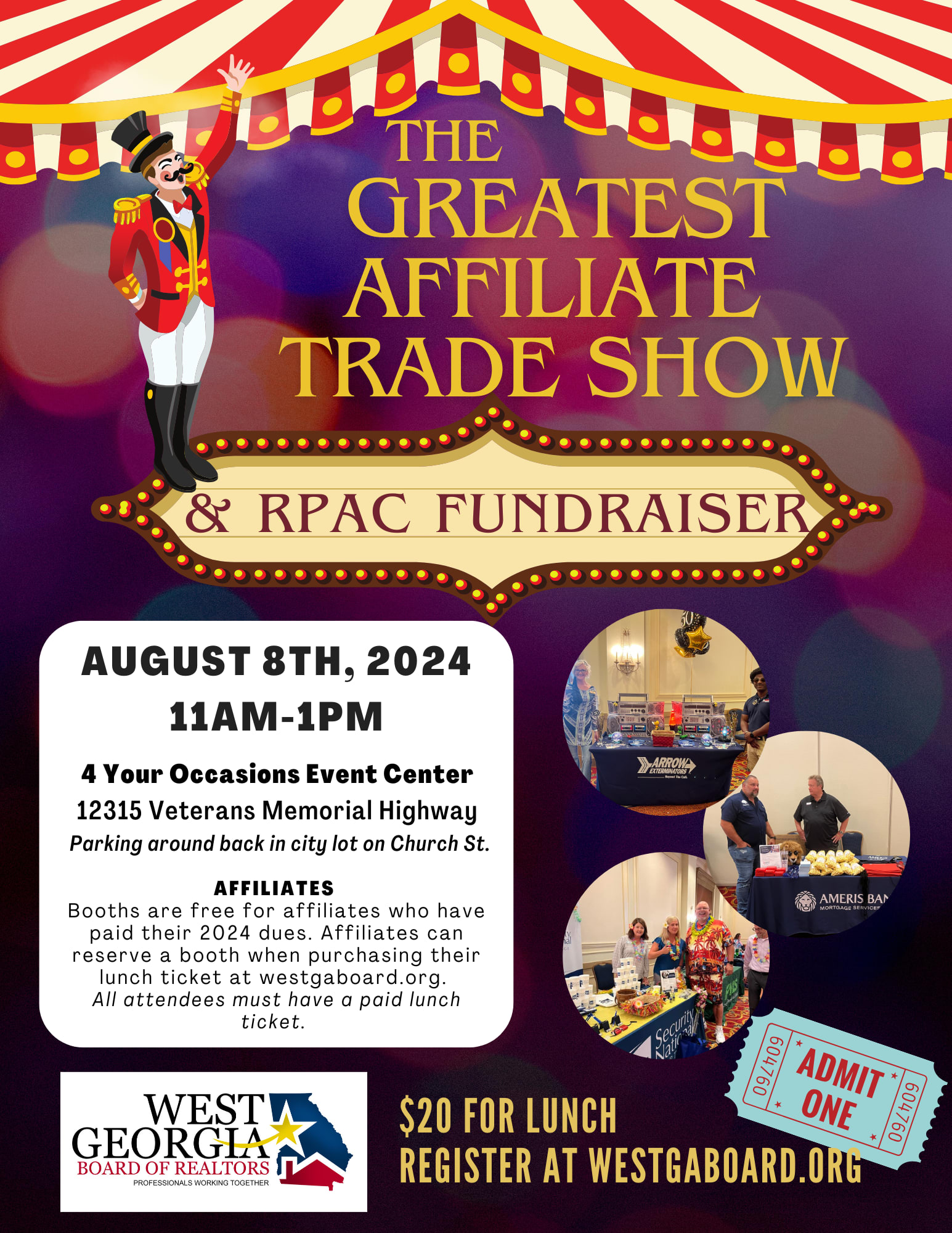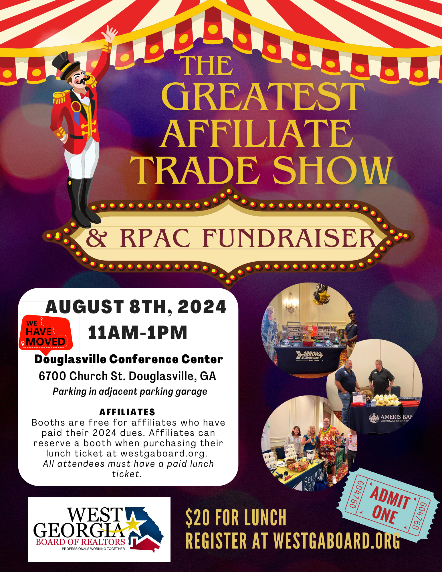 Join us for 'The Greatest Affiliate Trade Show' as we put the spotlight on our affiliates! Each year we try to come up with a fun theme for our affiliates to decorate their booths. All affiliates will each collect cards at their booths and then will do a drawing at the end of the trade show (not mandatory). REALTORS®, you wont want to miss all the awesome prizes and drawings! In addition to our trade show, we will be doing a RPAC fundraiser!Images
