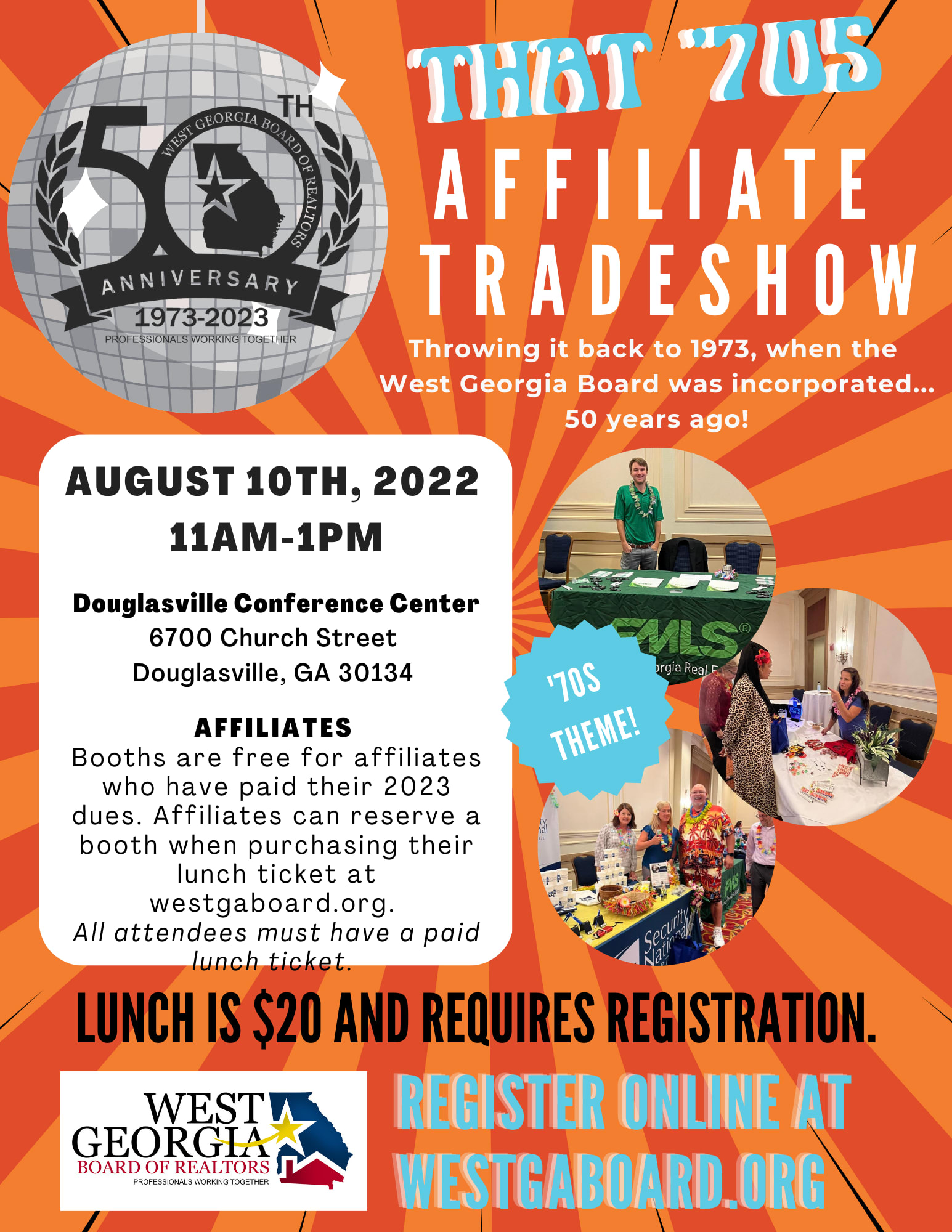 Join us for That 70's Affiliate Trade Show! The West GA Board has officially been incorporated since 1973 for FIFTY years! So this trade shows theme is 1970's Groovy! Join us as we put the spotlight on our affiliates. We will also have a ton of drawings at this event for REALTORS®, you wont want to miss it!Images