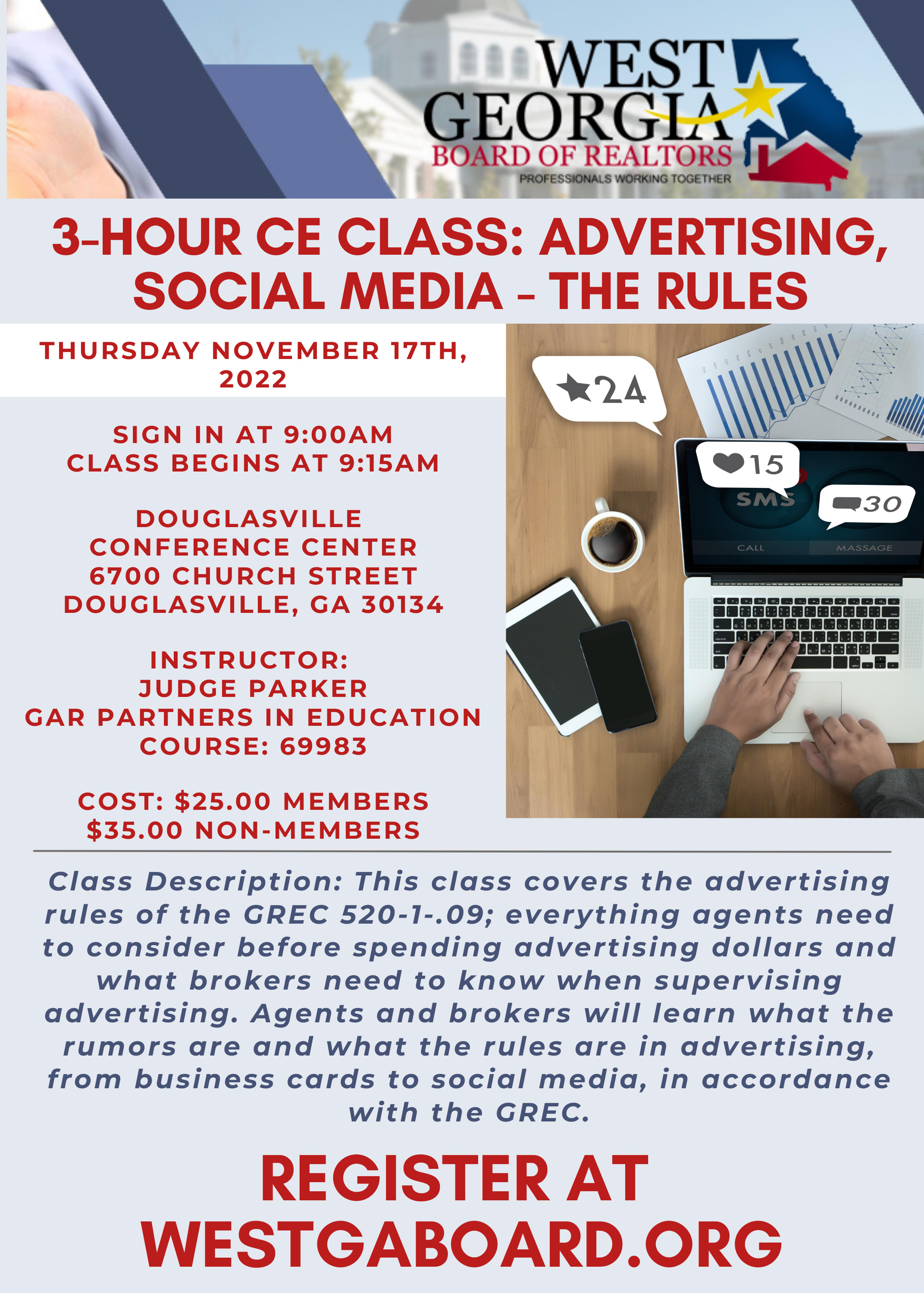 Thursday November 17th, 2022 Sign in at 9:00am Class begins at 9:15am Douglasville Conference Center 6700 Church Street Douglasville, GA 30134 instructor: Judge Parker GAR Partners in Education Course: 69983 Cost: $25.00 Members $35.00 Non-members This class covers the advertising rules of the GREC 520-1-.09; everything agents need to consider before spending advertising dollars and what brokers need to know when supervising advertising. Agents and brokers will learn what the rumors are and what the rules are in advertising, from business cards to social media, in accordance with the GREC.Images