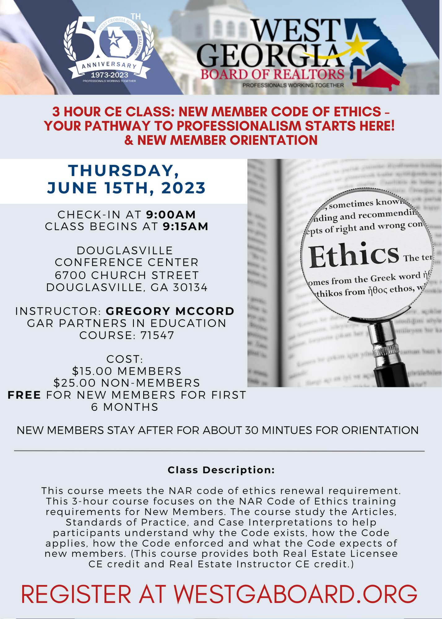 Class Description: This course meets the NAR code of ethics renewal requirement. This 3-hour course focuses on the NAR Code of Ethics training requirements for New Members. The course study the Articles, Standards of Practice, and Case Interpretations to help participants understand why the Code exists, how the Code applies, how the Code enforced and what the Code expects of new members. (This course provides both Real Estate Licensee CE credit and Real Estate Instructor CE credit.)