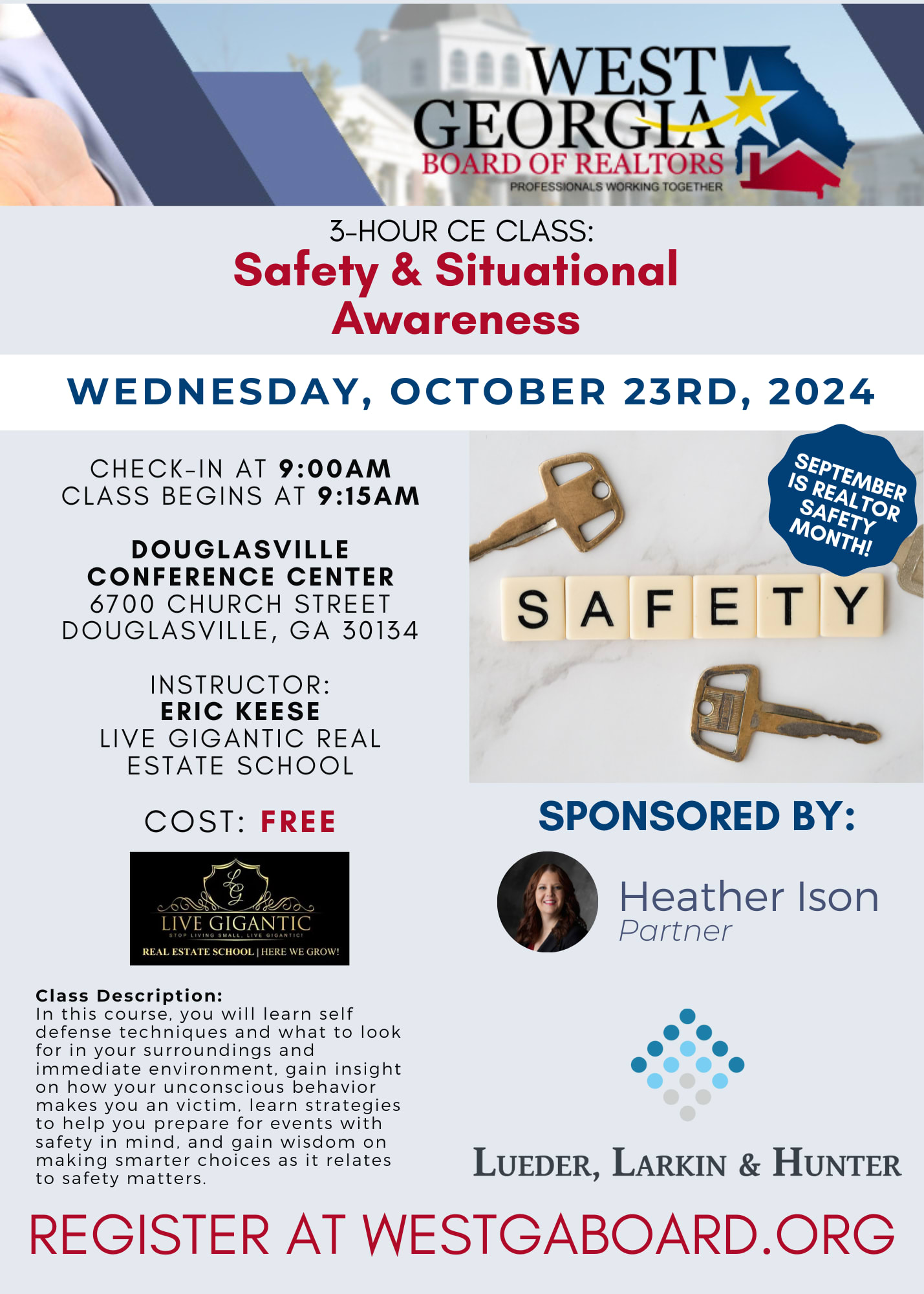 Instructor Eric Keese of Live Gigantic will teach you self defense techniques and what to look for in your surroundings and immediate environment, gain insight on how your unconscious behavior makes you a victim, learn strategies to help you prepare for events with safety in mind, and gain wisdom on making smarter choices as it relates to safety matters.
