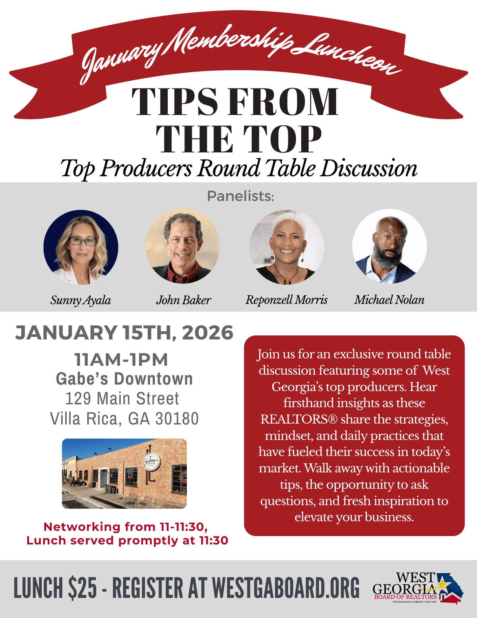 Kick off the new year with invaluable insights at our January Membership Luncheon! Join us for “Tips from the Top,” an exclusive round table discussion featuring some of the West Georgia's most successful REALTORS®: Sunny Ayala, John Baker, Reponzell Morris and Michael Nolan.