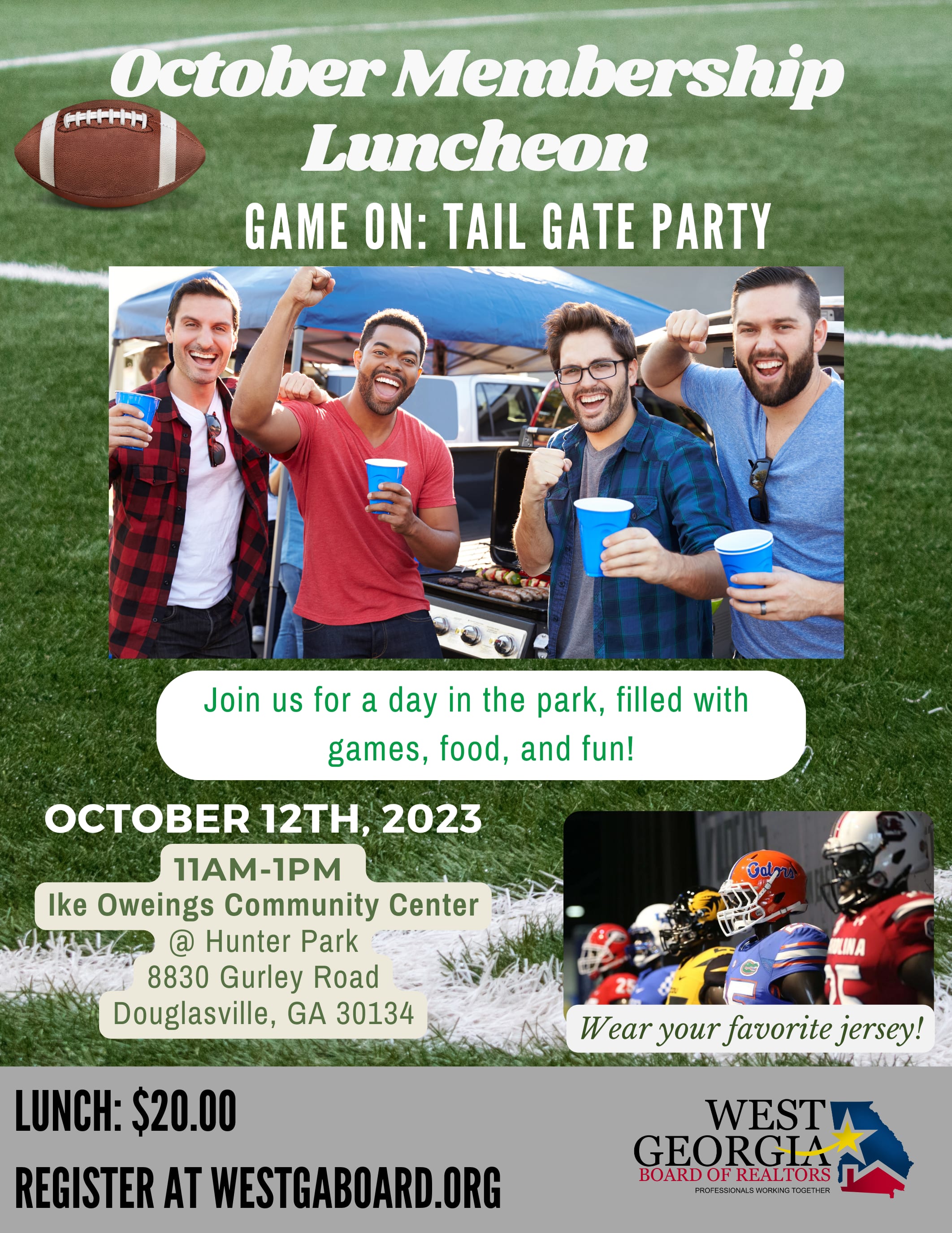 Join us for a tailgate party at Hunter Park! Be sure to wear your team's jersey!