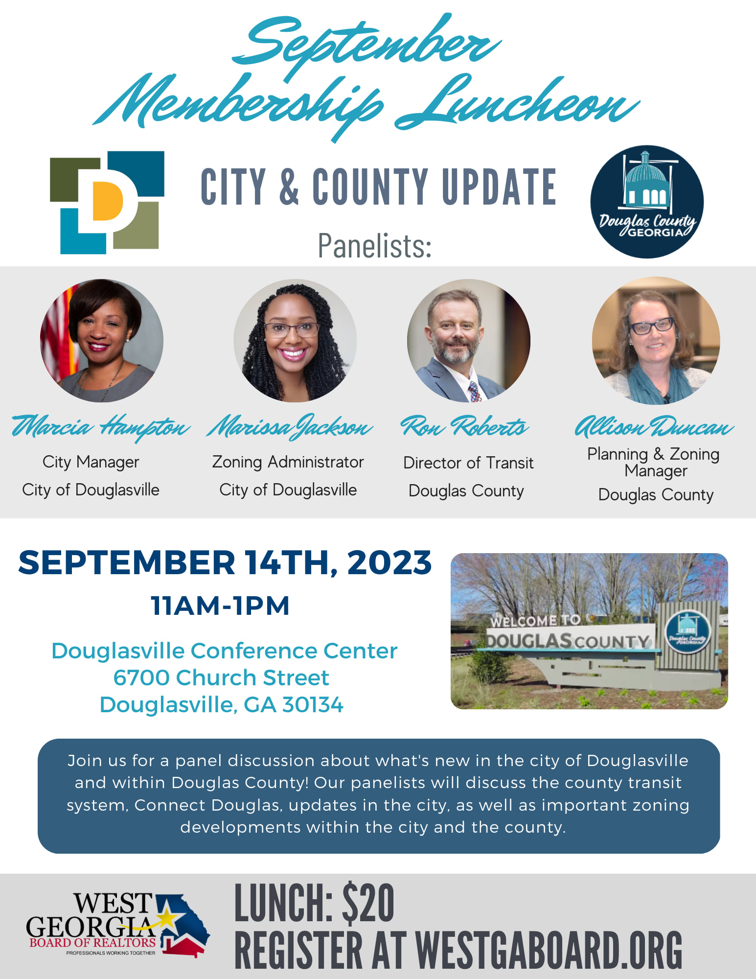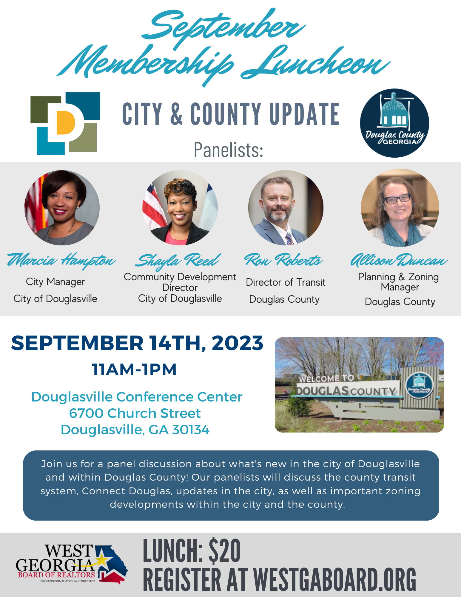 Join us for a panel discussion about what's new in the city of Douglasville and within Douglas County! Our panelists will discuss the county transit system, Connect Douglas, updates in the city, as well as important zoning developments within the city and the county.Images